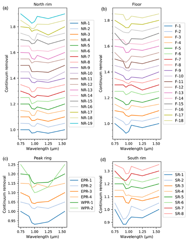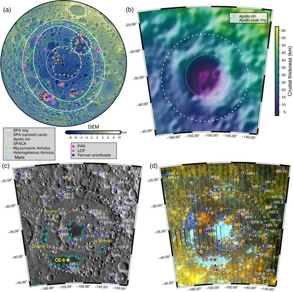 在这项最新研究中,属于纯斜长岩,根据其地理位置分为四组(a)北部盆缘,为研究月球岩浆洋冷却过程、(b)盆底,